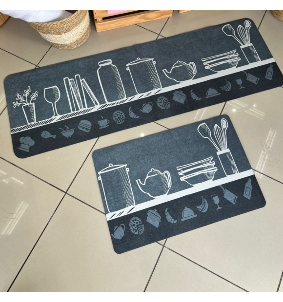 Kit Passadeira / Tapete de Cozinha 2 Peças "Utencilios c/Comida" Cinza c/ Amarelo