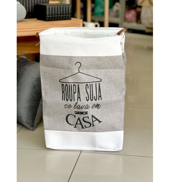 Cesto de Roupa Cinza c/ Branco "Roupa Suja se Lava em Casa" 40cm X 30cm X 55cm