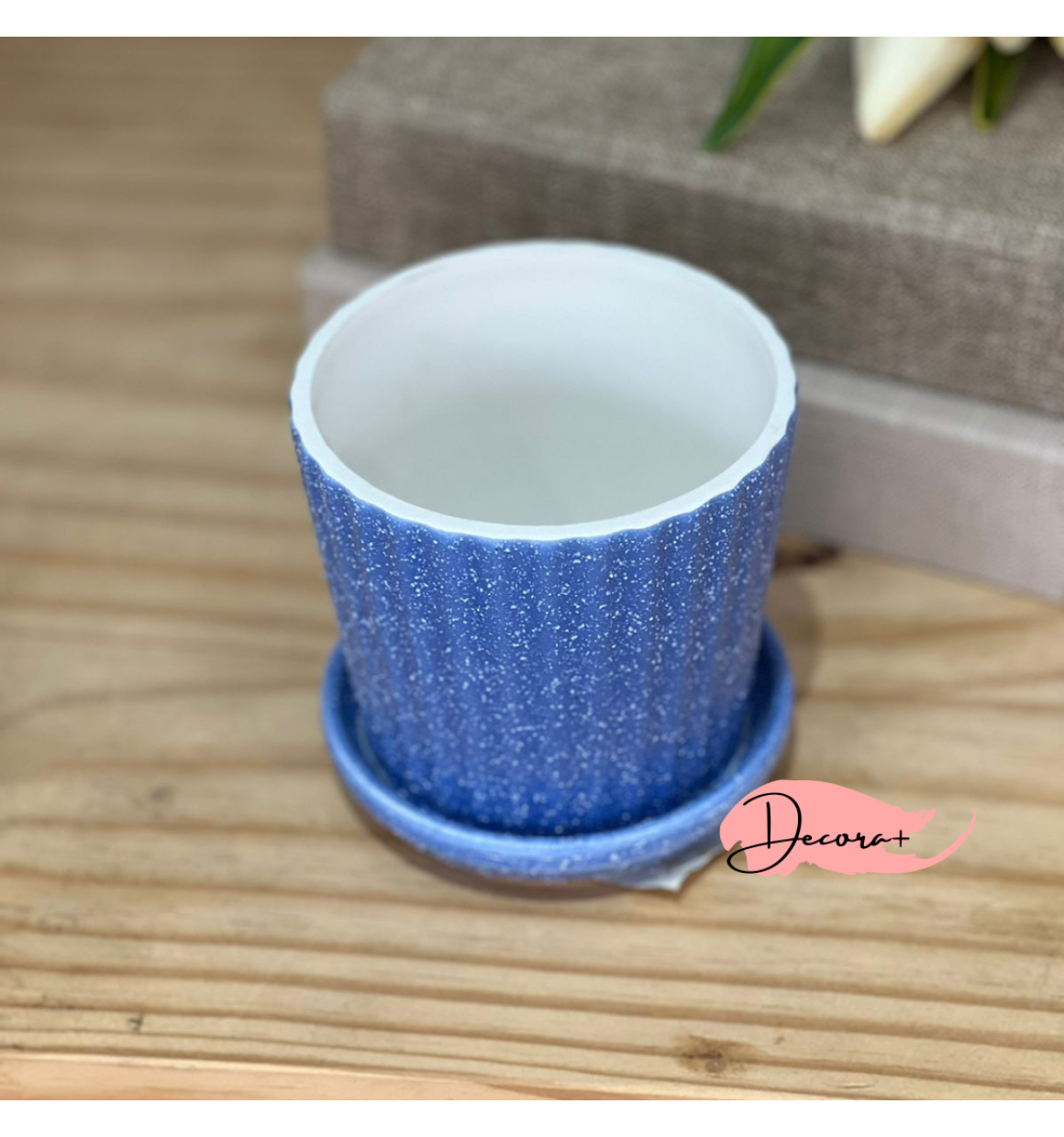 Vaso de Cerâmica Texturizado com Prato Azul Escuro - 10cm X 10cm