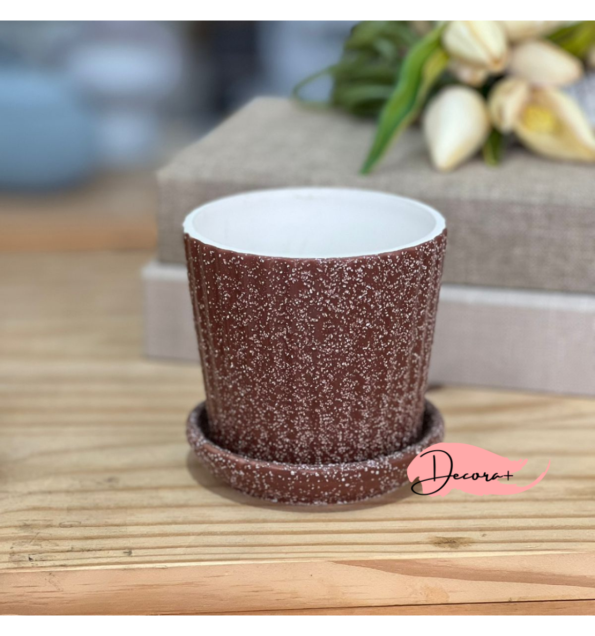 Vaso de Cerâmica Texturizado com Prato Marrom - 10cm X 10cm