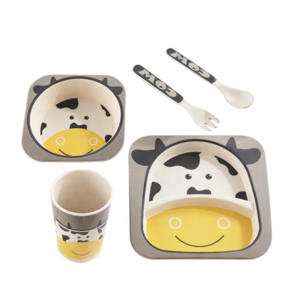 1 prato com divisórias 21cm, 1 tigela 14cm ,1 copo 9,5cm 1 garfo e 1 colher de 13cm .