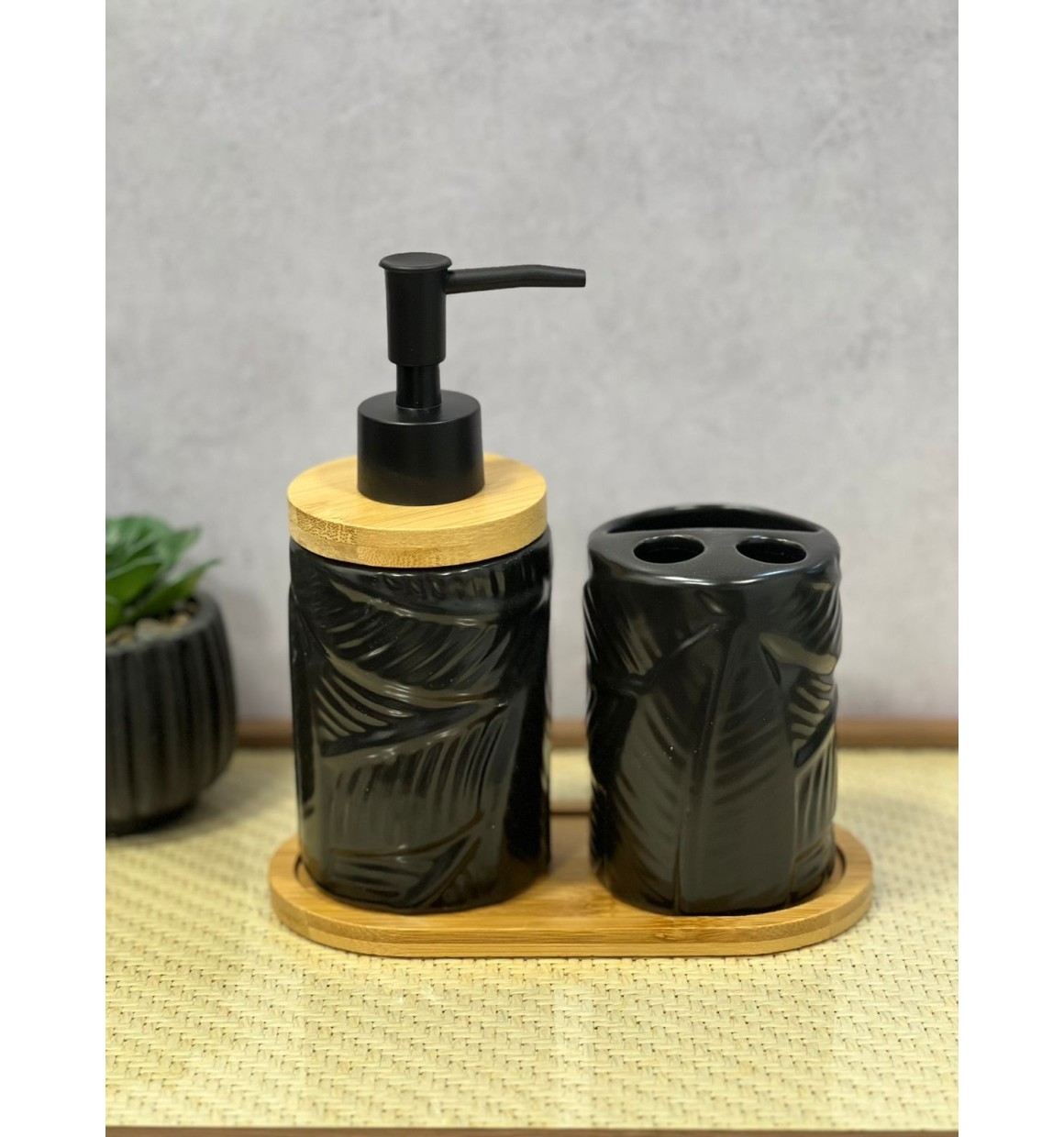 Kit de Banheiro Preto de Porcelana e Bambu - 3 Peças